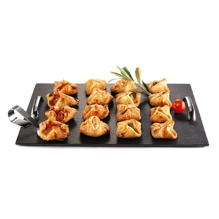 Assortiment de 16 mini-feuilletés : Jambon cuit supérieur et moutarde à l'ancienne x4 Fromage de chèvre et épinards x4 Duo de saumon et persil x4 Chorizo et poivrons x4